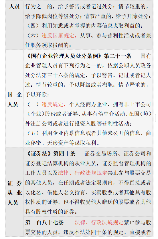 2.禁止情形和负面清单主要包括七类行为、四类对象。“违反有关规定从事营利活动”意味着《纪律处分条例》和《政务处分法》本身并未对禁止事项和行为作出详细规定,需要援引相关党规国法的规定。根据《证券法》和《关于党政机关工作人员个人证券投资行为若干规定》的规定,